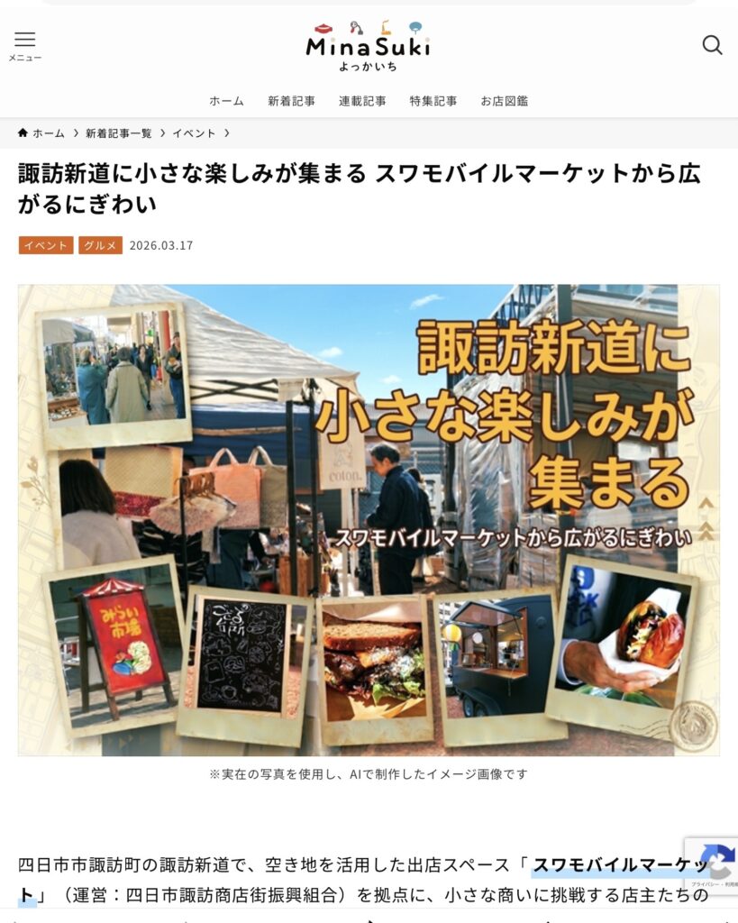 四日市・菰野・鈴鹿など三重北勢エリアのグルメ・お店・イベント・暮らしの情報を発信する「MinaSukiよっかいち」にてスワモバイルマーケットをご紹介いただきました。